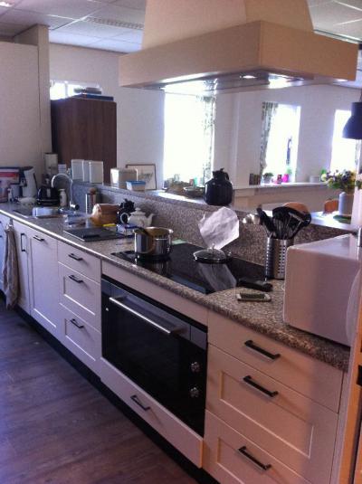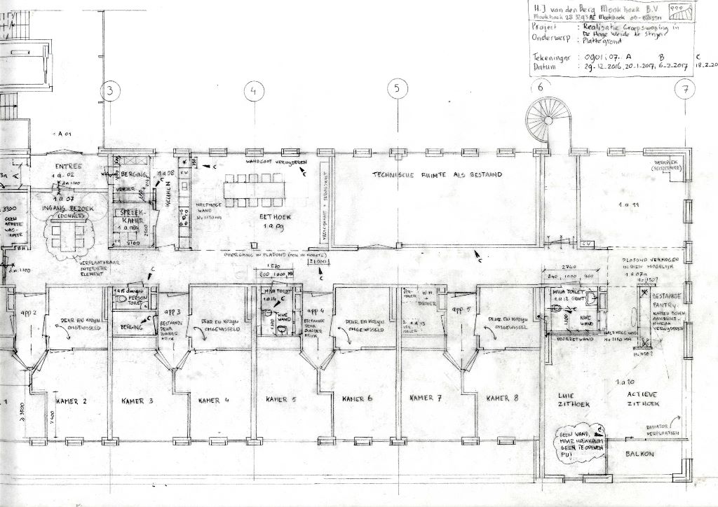 Van de afdeling Kortdurend Verblijf met 6 appartementen werd te weinig gebruik gemaakt en de verwachting was dat met de oplevering van het revalidatiecentrum in Oud-Beijerland de bezetting nog minder zou worden. Om dat er wel vraag was naar huisvesting voor mensen met dementie werd Henk Jan van den Berg in het voorjaar 2016 benaderd voor een haalbaarheidsonderzoek. Vanuit zijn samenwerking met BreinCollectief had hij er een hard hoofd in, dat daar een goede groepswoning van te maken was. Het lag op de eerste verdieping, zonder buitenruimte met een lange gang, die aan één zijde wordt geflankeerd door een technische ruimte. Erg saai. De enige mogelijkheden om een woonkamer te maken waren aan de noordgevel gepositioneerd. Voor het kantoor van de thuiszorg en de fysiotherapie ruimte moest er dan eerst nog wel een andere ruimte gevonden worden. De enige zone die direct te annexeren was leken de kleedruimten. Totdat het besef doordrong dat mensen met dementie liever niet te veel ruimte voor zichzelf hebben. Door een appartement op te delen in twee slaapkamers met een gemeenschappelijke badkamer kon er een groepswoning voor 8 mensen in plaats van 6 gerealiseerd worden. Zodoende konden er twee appartementen worden vrijgespeeld. Het appartement aan de westzijde kon gehandhaafd blijven voor kortdurend verblijf. Het appartement aan de oostzijde heeft een buitenruimte en vormt de ideale lichte woonkamer om 's ochtends actief te worden. De gang vormt nu een logische relatie tussen de woonkamer en de eetkeuken. Binnen twee weken lag het definitieve haalbaarheidsonderzoek met 7 scenario’s inclusief kostenraming bij de opdrachtgever. Na het nodige overleg met betrokken partijen waren de fysiotherapeut en de thuiszorg blij dat ze naar de begane grond konden verhuizen en de planners dat ze naar boven mochten. In december 2016, nadat het goedkeuren van de jaarbegroting is het project weer opgepakt. Uitwerken, aanbesteden, opdracht verstrekken, werk voorbereiden, uitvoeren en eind maart opleveren. Dit hele traject is binnen vier maanden doorlopen. Niet dat het een makkie was. Het afkoppelen van de douches, toiletten en keukenblokken moest wel goed gebeuren om geen legionella probleem te veroorzaken. De ingang van de slaapkamers is proefondervindelijk vastgesteld om de bedtoegankelijkheid te garanderen. Daarnaast spelen bij dit soort projecten de brandweervoorzieningen altijd een grote rol. En als je volgens de ideeën van het BreinCollectief wilt werken zul je ook de nodige aandacht aan de beleving moeten besteden. De medewerkers dachten goed mee en zo is er onder andere een koof boven de kookplaat gekomen en zijn de kabelgoten uit het zicht genomen door bredere vensterbanken. Op hun voorstel is ook een wand verwijderd om het zicht op de groep vanuit de pantry te verbeteren. |